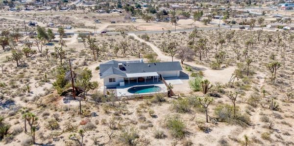 Welcome to Sky Harbor one of the most sought-after communities in the High Desert. Completely renovated from floor to ceiling. Spanish charm with a Modern spin! Enter the property by driving through you own private gates onto the cactus adorned semi-circular driveway, allowing you to pull into one side and exit the other without ever backing up. Shake up a cool martini from the Palm Springs style wet bar. In the winter, strike up a nice warm fire on a cool night in your chic stone fireplace. Relax on the back porch, while gazing out at a sea of joshua trees for as far as you can see. Enjoy starry nights from the hot tub and wooden chaise lounges.